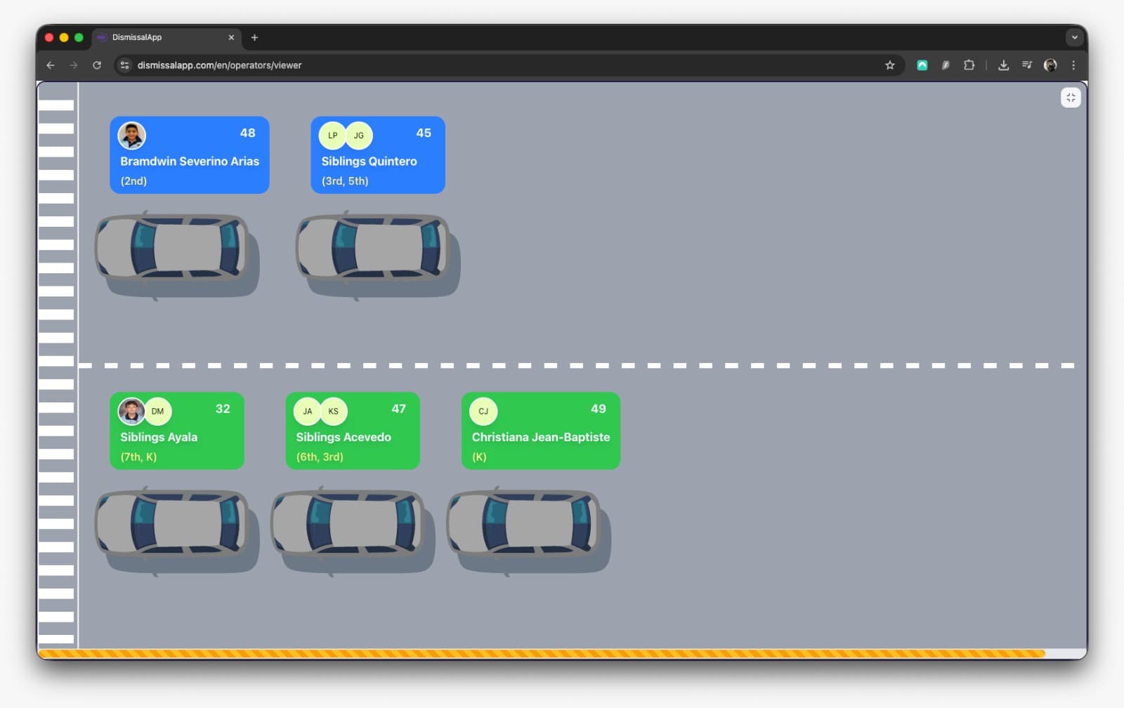 A bilingual school dismissal platform that coordinates vehicle pickup queues, student records, and campus operations from one interface. Built to keep frontline staff moving quickly while giving leadership a clear view of performance over time.